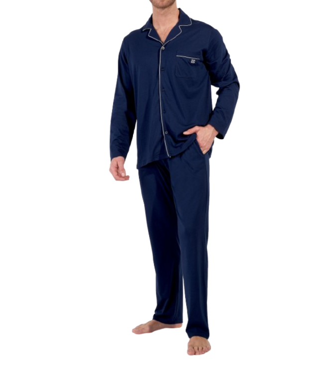 De HOM Rafael Long Sleepwear in Navy is de perfecte combinatie van stijl, zachtheid en comfort. Deze lange pyjamaset is vervaardigd uit een hoogwaardige mix van 50% katoen en 50% modal, wat zorgt voor een soepele, ademende en zijdezachte stof die ideaal is voor een goede nachtrust. Het bovenstuk heeft lange mouwen, een ronde hals en een effen navykleurige uitstraling die rust en elegantie uitstraalt. De bijpassende lange broek is voorzien van een comfortabele elastische tailleband voor een perfecte pasvorm zonder te knellen. Dankzij de modalvezel voelt de stof extra zacht aan, met een licht glanzende afwerking en uitstekende vochtregulatie. De combinatie van katoen en modal biedt het beste van twee werelden: de natuurlijke frisheid van katoen en de luxueuze zachtheid van modal. Dit maakt de HOM Rafael pyjama niet alleen geschikt om in te slapen, maar ook ideaal om in te loungen tijdens ontspannen momenten thuis. Een stijlvolle en comfortabele keuze voor de moderne man die houdt van kwaliteit tot in detail – of als luxueus cadeau voor iemand anders.